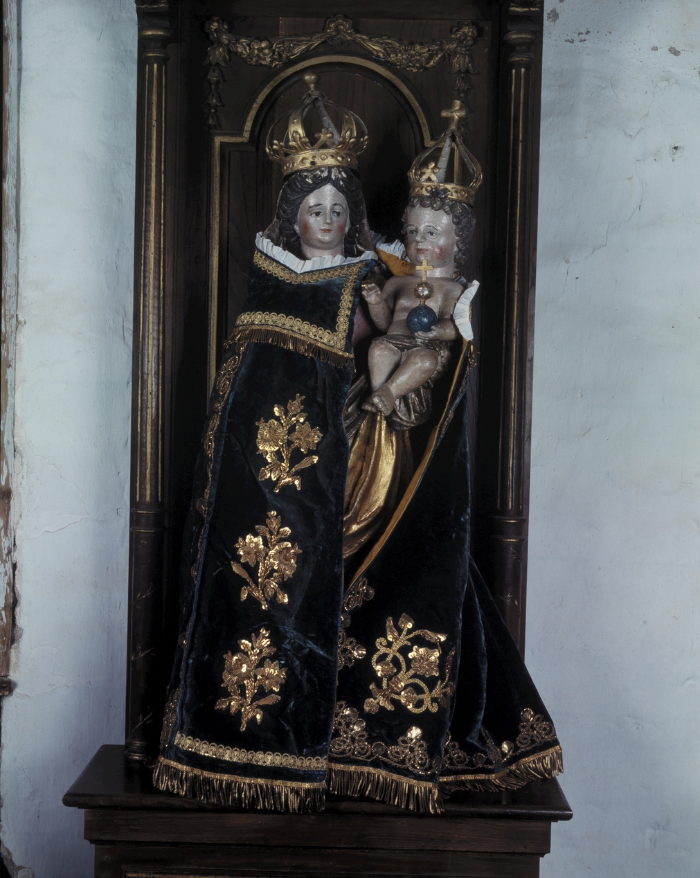 Chapelle Saint-Mélec : statue de procession de la Vierge à l'Enfant portant un manteau bleuImmatriculation