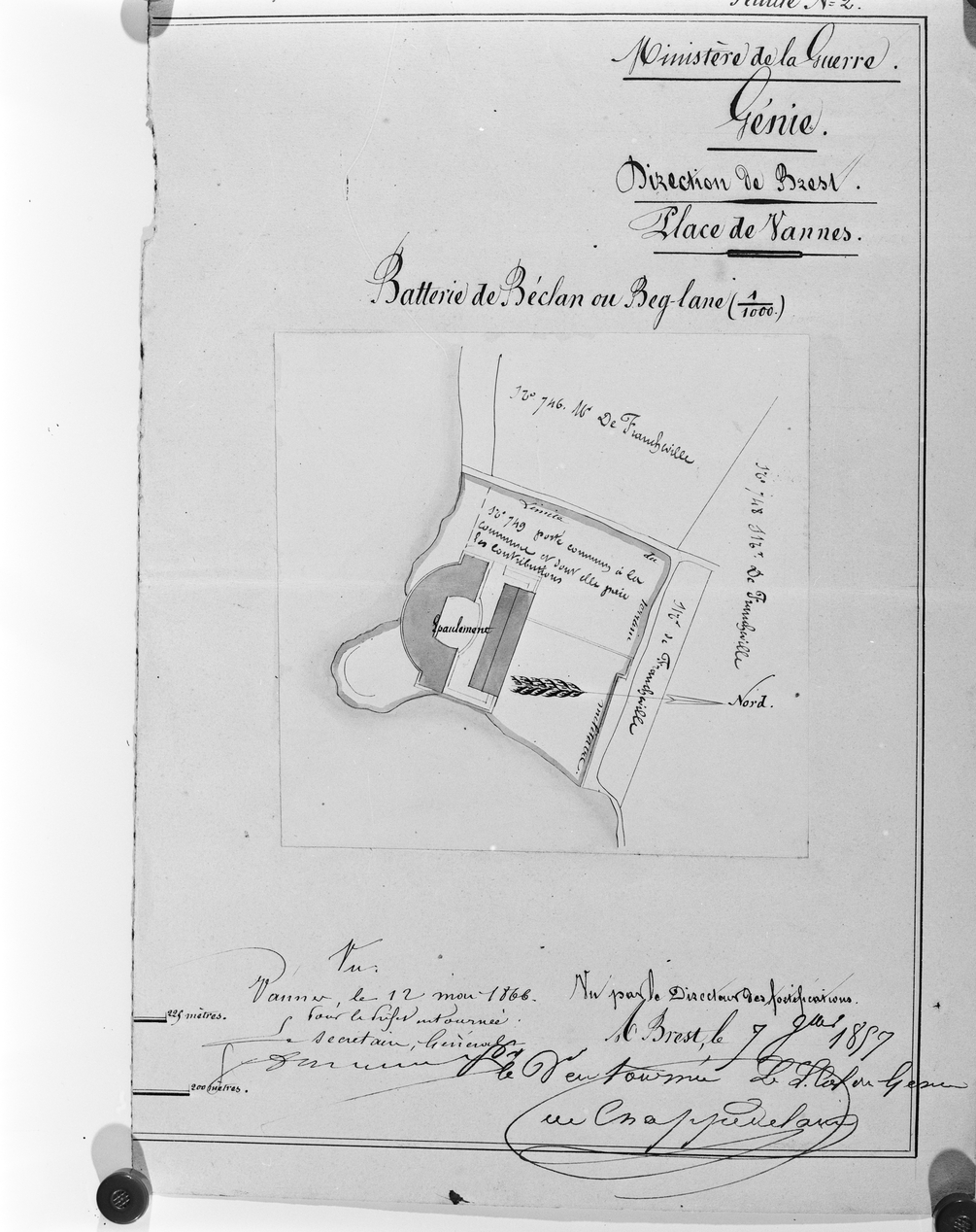 Plan de masse, dessin du Génie, direction de Brest, daté 1866 (Doc. A.D. Morbihan).Immatriculation
