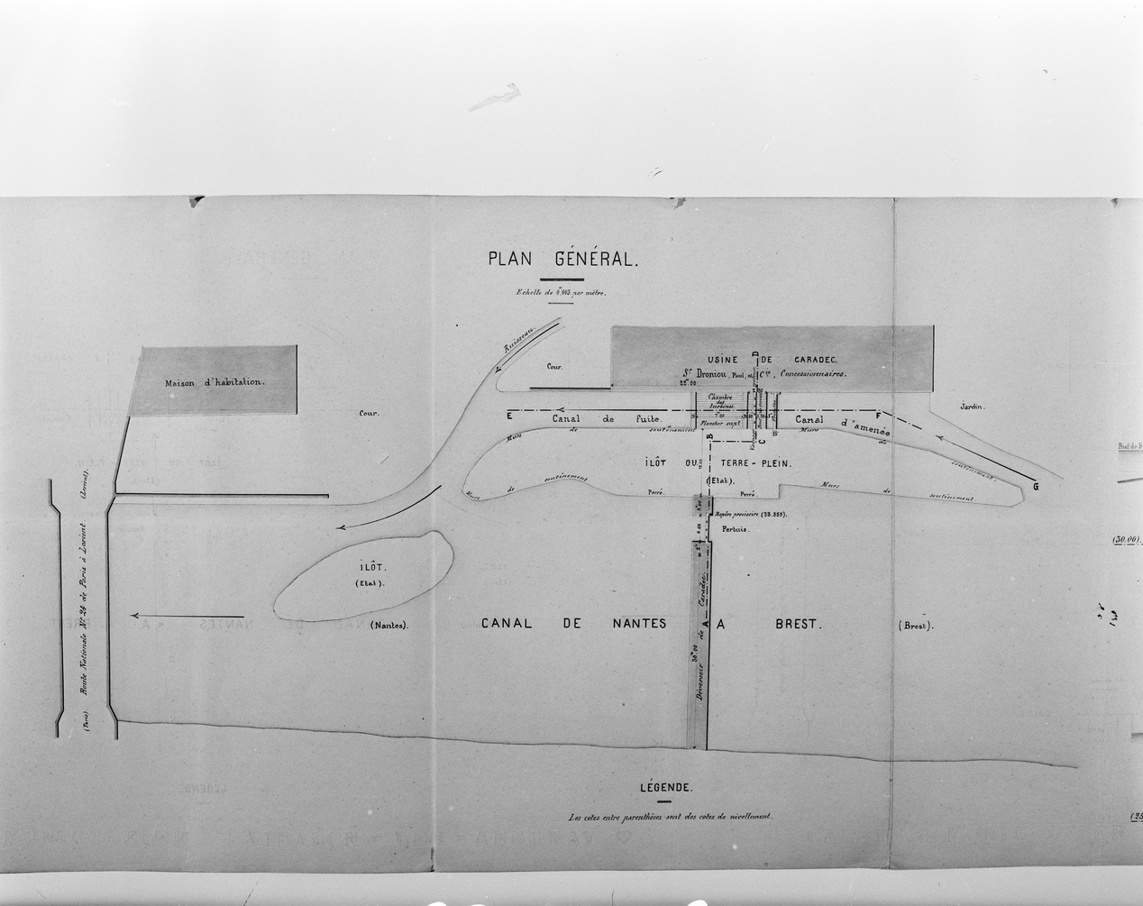 [Usine de Caradec]. Plan général, profil en long suivant EFG et coupe suivant ABCD. Dessin, [1887]. Papier, encre, aquarelle.