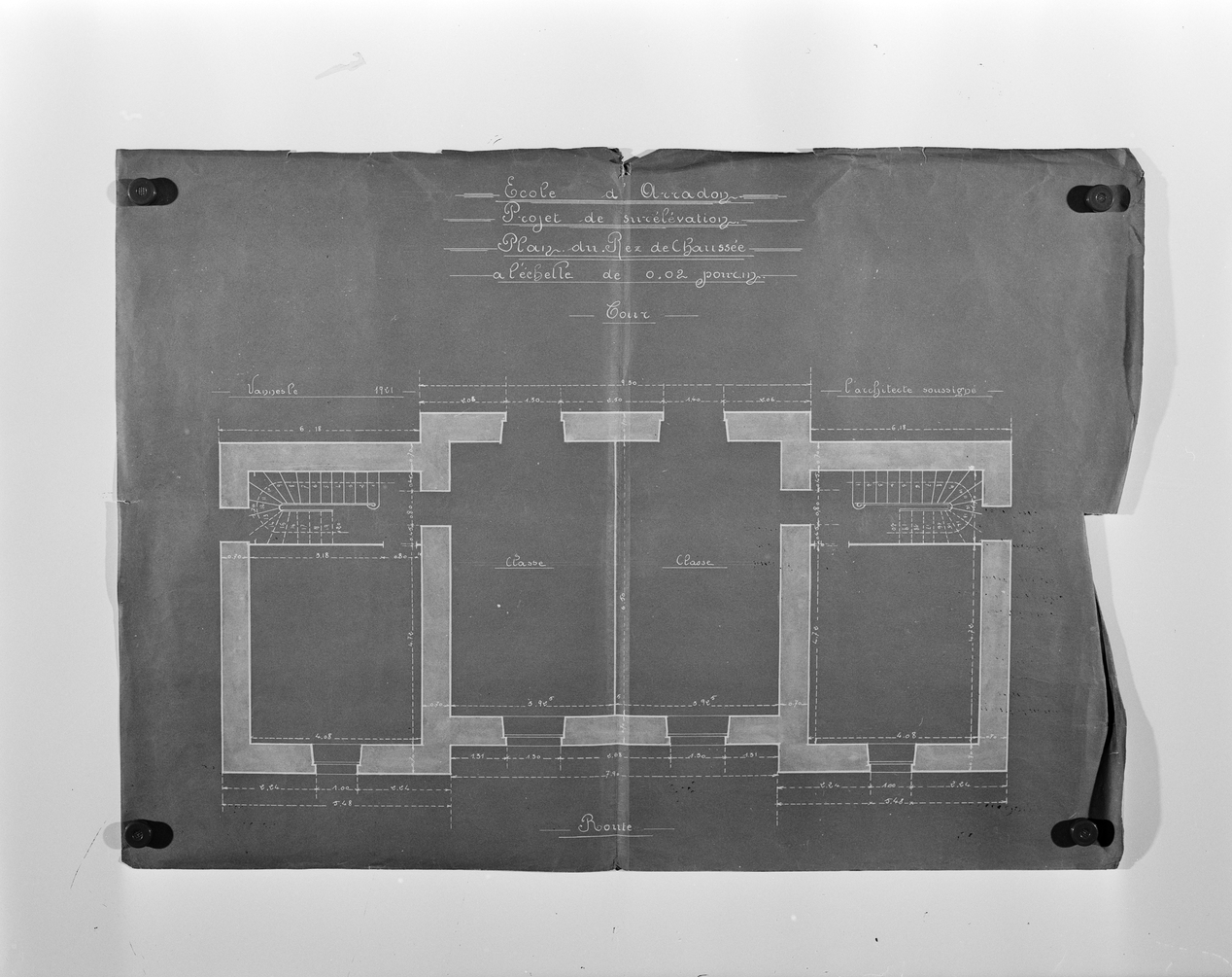 Ecole, mairie, projet de rehaussement, plan du rez-de-chaussée, vers 1921.Immatriculation