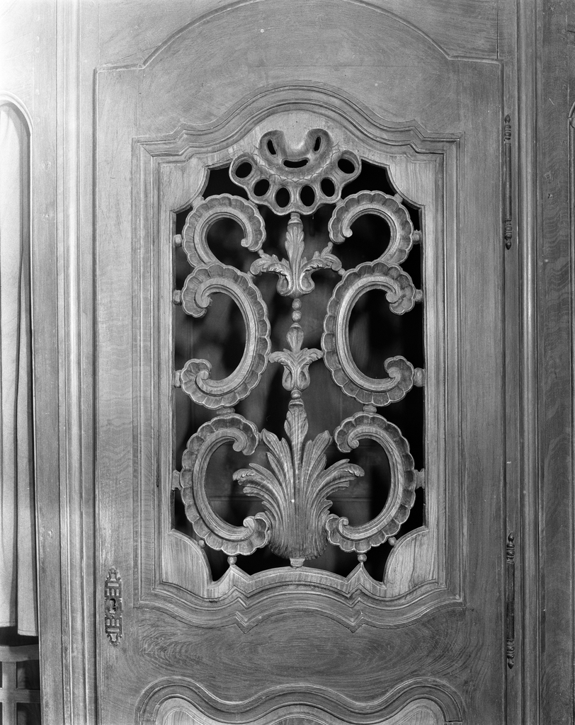 Confessionnal n°1, battant, détail du panneau ajouré.Immatriculation