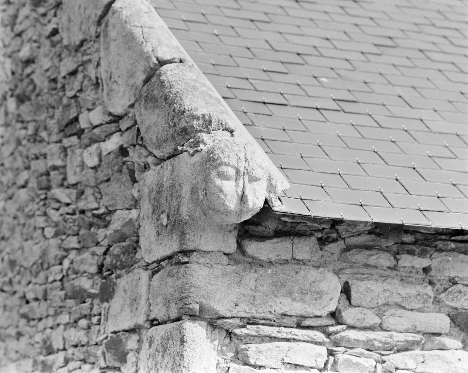 La Villeneuve, pignon : détail tête sculptée.Immatriculation