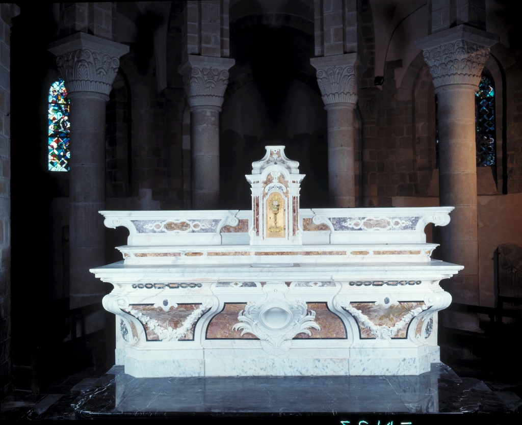 Autel, gradins d'autel (2), tabernacle (maître-autel, autel tombeau, de milieu), abbaye de bénédictins Saint-Gildas, de bénédictins de la congrégation de Saint-Maur, de soeurs de la charité de Saint-Louis (Saint-Gildas-de-Rhuys),