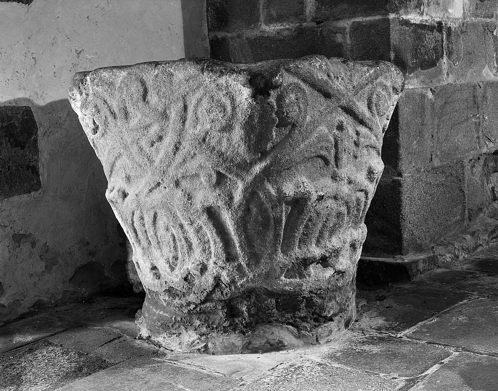 Chapiteaux (2), bénitier, abbaye de bénédictins Saint-Gildas, de bénédictins de la congrégation de Saint-Maur, de soeurs de la charité de Saint-Louis (Saint-Gildas-de-Rhuys),