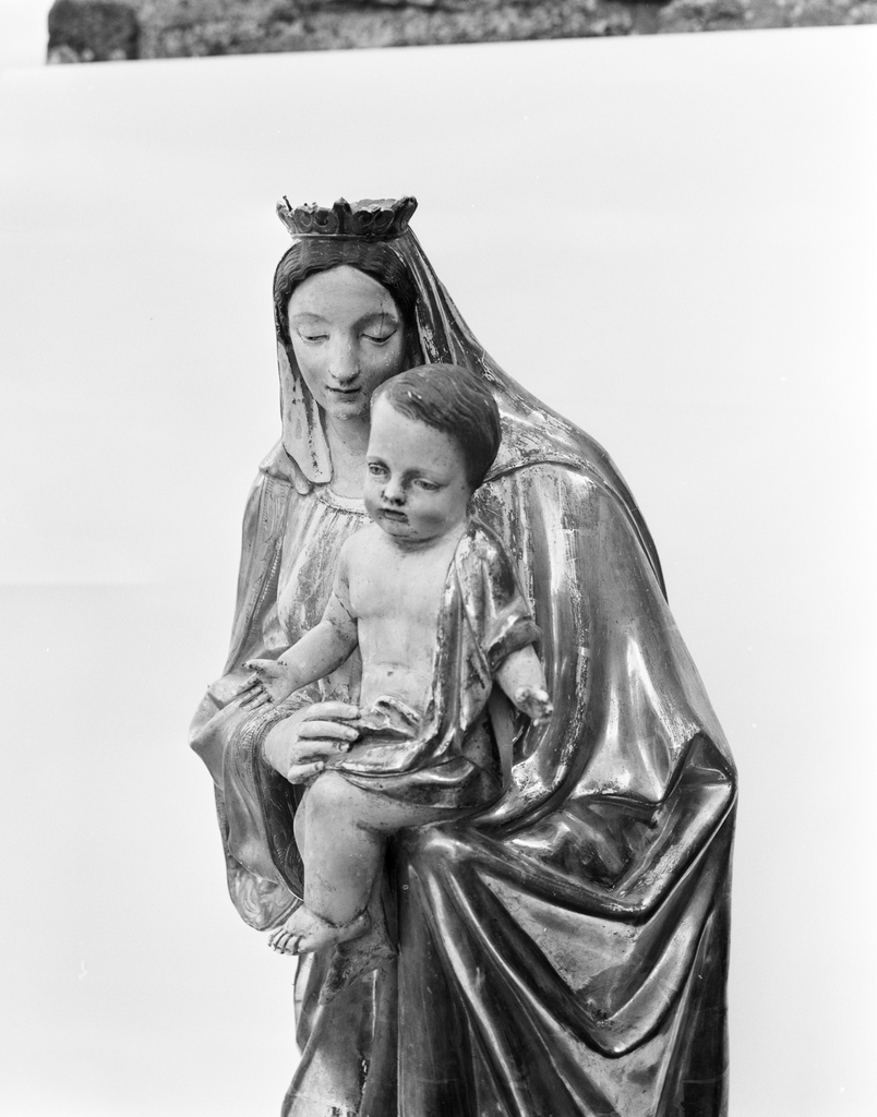 Statue Vierge à l'Enfant, partie supérieure, vue de trois-quarts.Immatriculation