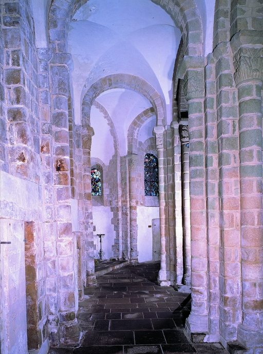 Vue intérieure : déambulatoire, côté nord. inscription..Immatriculation
