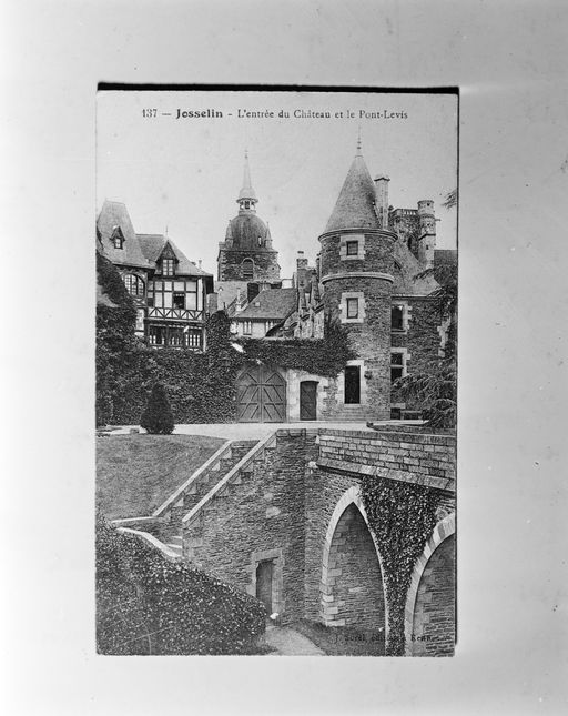 [Josselin - Entrée nord et pont sur les anciennes douves du château]. Carte postale, Rennes : J. Sorel, édit., [1er quart 20e siècle].