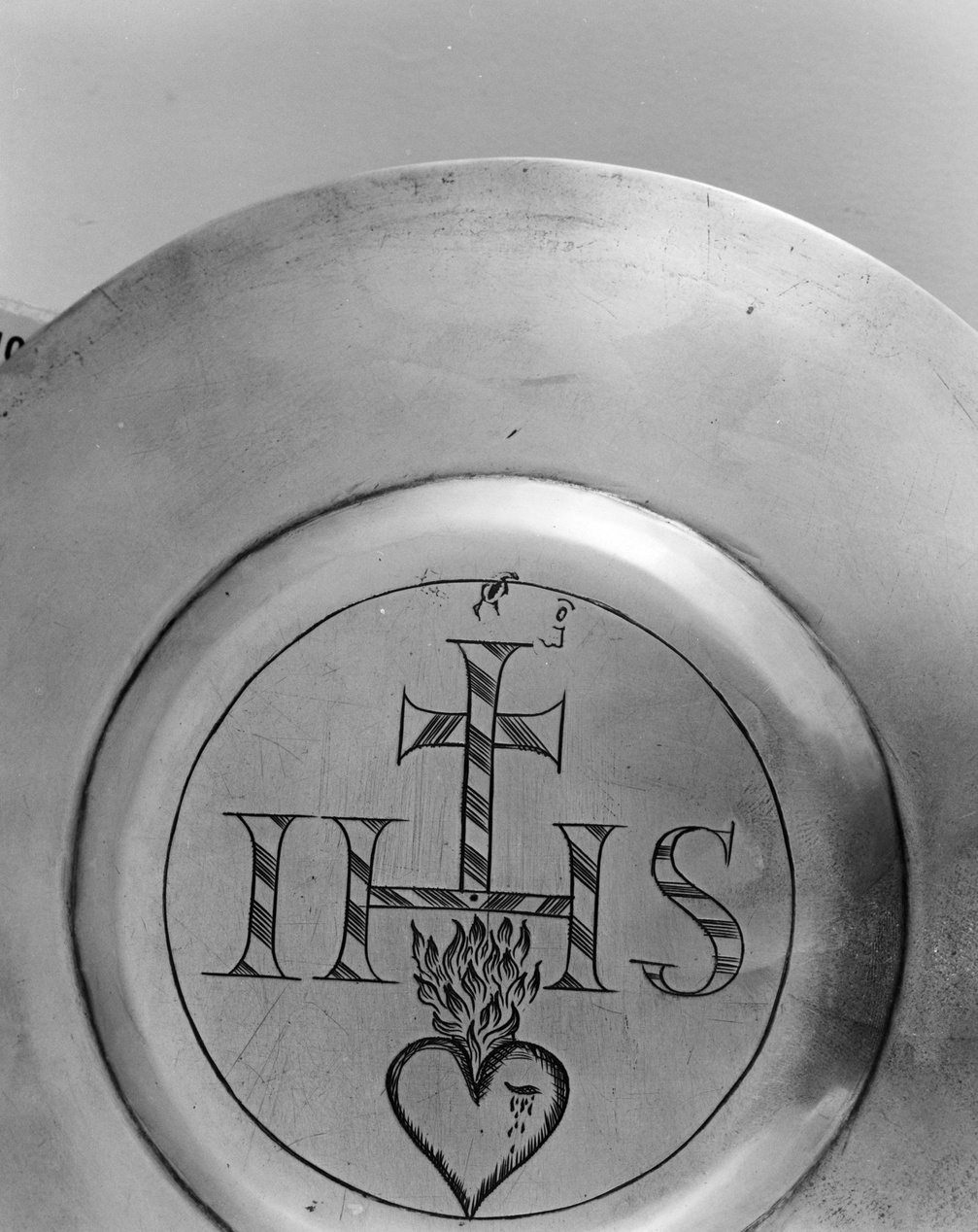 Patène, détail des poinçons, lettre date et poinçon de charge.Immatriculation