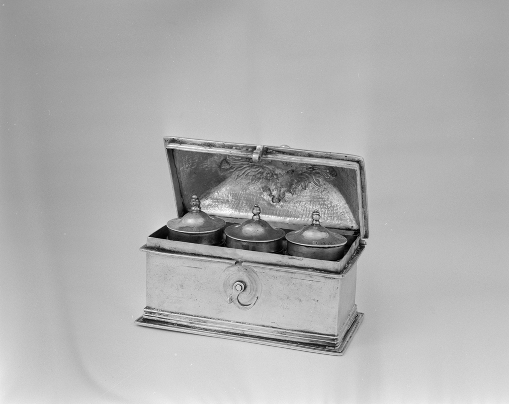Coffret aux saintes huiles, vue avec le couvercle ouvert.Immatriculation