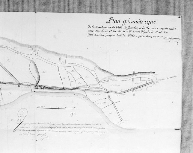 A. D. Ille-et-Vilaine. Série C 730/3. Plan géométrique de la banlieue de la ville de Josselin et du terrein compris entre cette banlieue et la rivière d'Aoust, depuis le pont du Gué-Bardin jusqu'à ladite ville. Dessin, par Monnier, 08 août 1771.