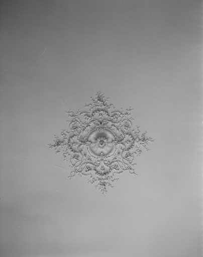 Salon, vue de détail du décor sculpté du salon.Immatriculation