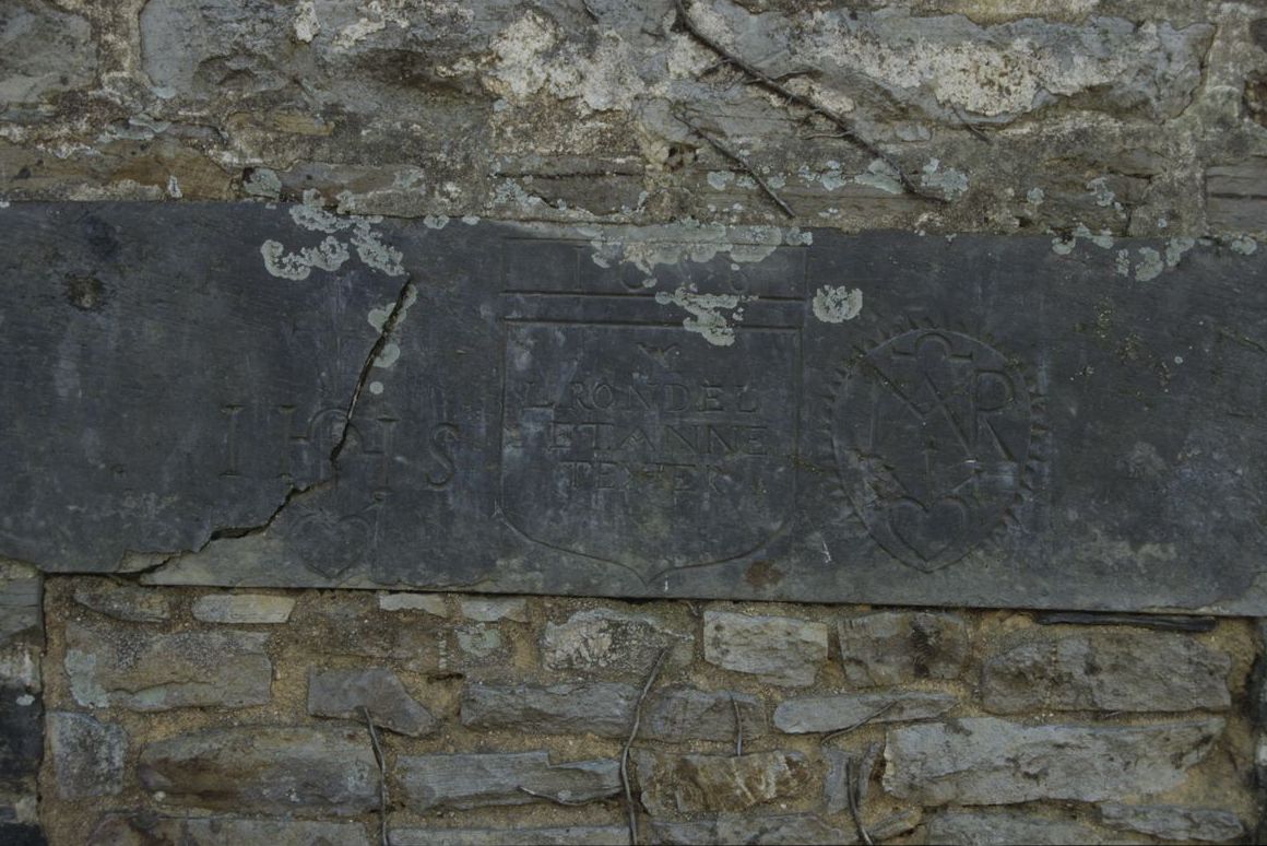 Linteau de porte : détail du décor porté (motifs chrétiens et maçonniques ?).Immatriculation