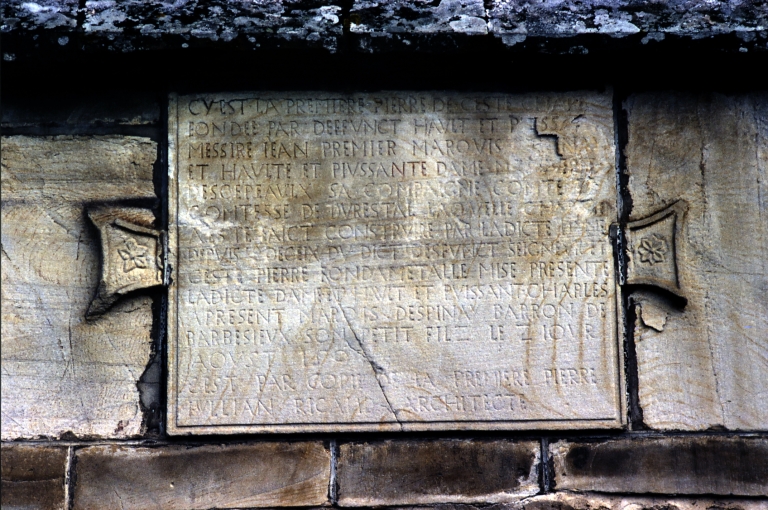Vue de détail d'un cartouche gravé sur un mur de l'église.Immatriculation