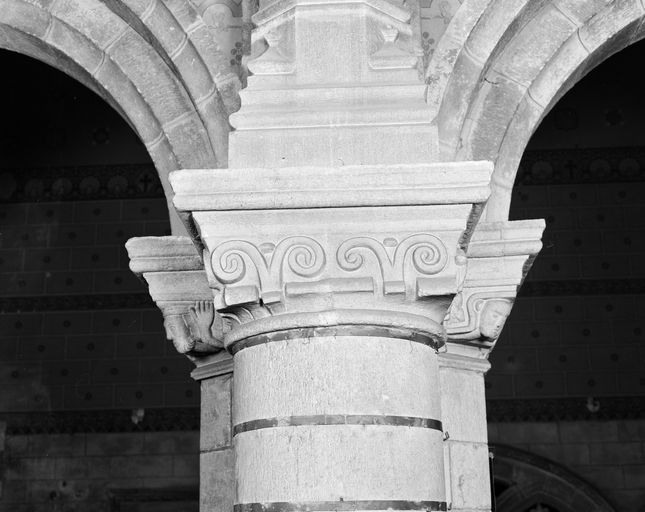 Entre chœur et chapelle nord, pilier central, chapiteau, face ouest : décor de volutes (état en 1994)Immatriculation