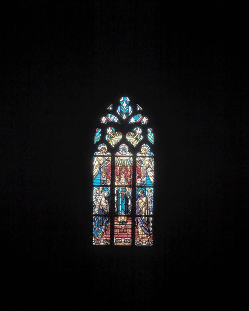 Ensemble des 2 verrières de la baie 7 : Mariage de la Vierge, et de la baie 9 : Immaculée Conception, basilique Notre-Dame-du-Roncier (Josselin),