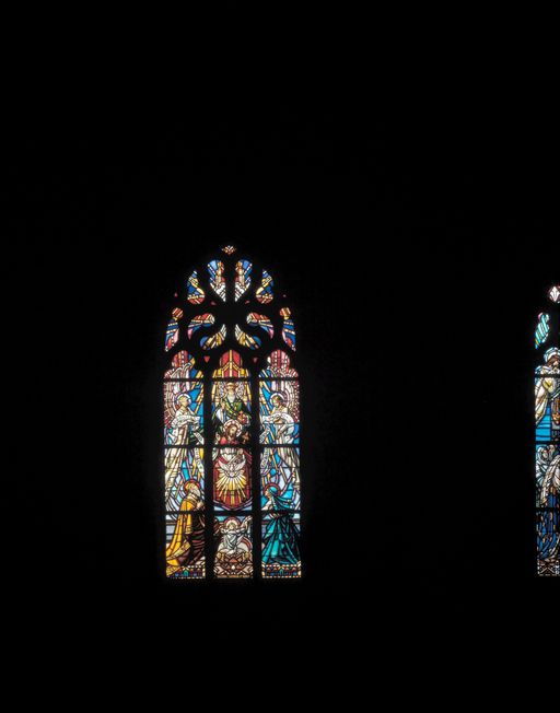 Ensemble des 2 verrières de la baie 7 : Mariage de la Vierge, et de la baie 9 : Immaculée Conception, basilique Notre-Dame-du-Roncier (Josselin),