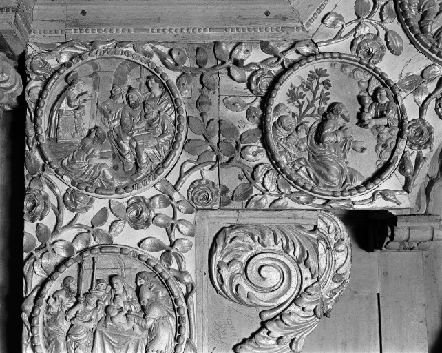 Encadrement de la contretable à gauche, médaillons : Jésus et les Docteurs, Jardin des OliviersImmatriculation