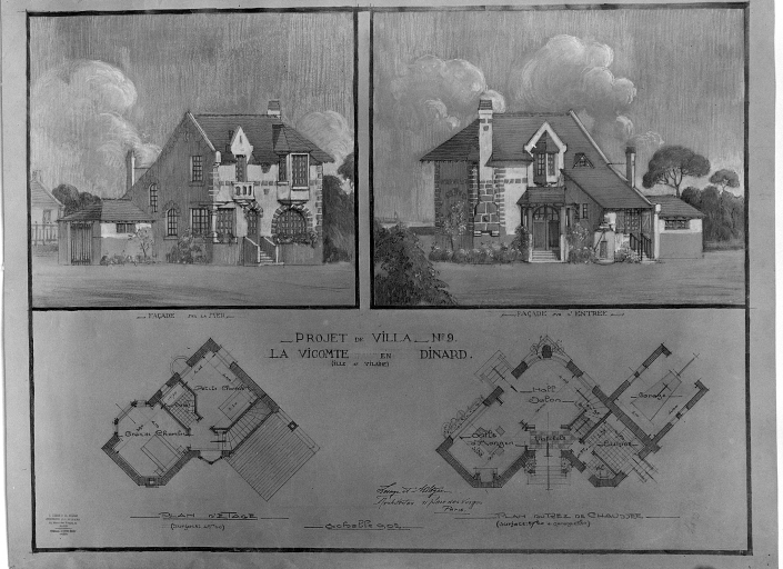 Projet de villa n°9, élévation façade sur mer, façade sur l'entrée, plan du rez-de-chaussée, plan de l'étage.Immatriculation