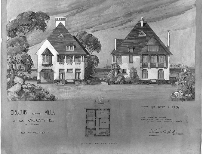Projet de villa, variation du type D, croquis d'une villa, élévation façade principale sur jardin, élévation façade sur mer, plan du rez-de-chaussée.Immatriculation