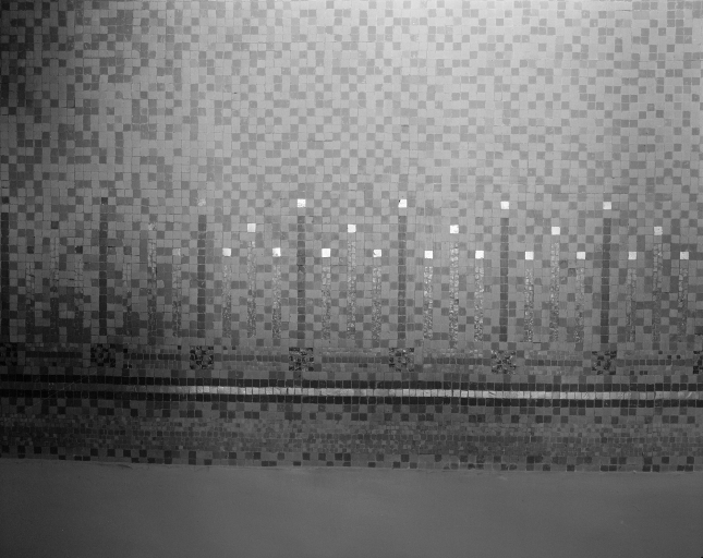 Salle de bains, détail de la mosaïque murale.Immatriculation