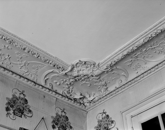 Détail de la frise du plafond de la salle-à-manger (feuillage, colombes, libellules).Immatriculation