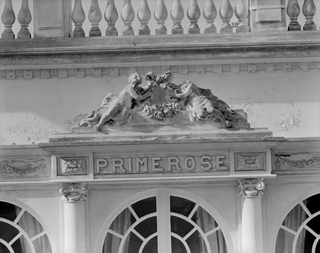 Elévation est, détail du linteau de la baie centrale, avec anges présentant une guirlande de fleurs.Immatriculation