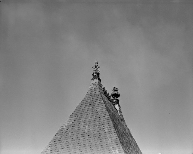 Epis de faîtage en grés émaillé de la tour à toit à l'impériale.Immatriculation