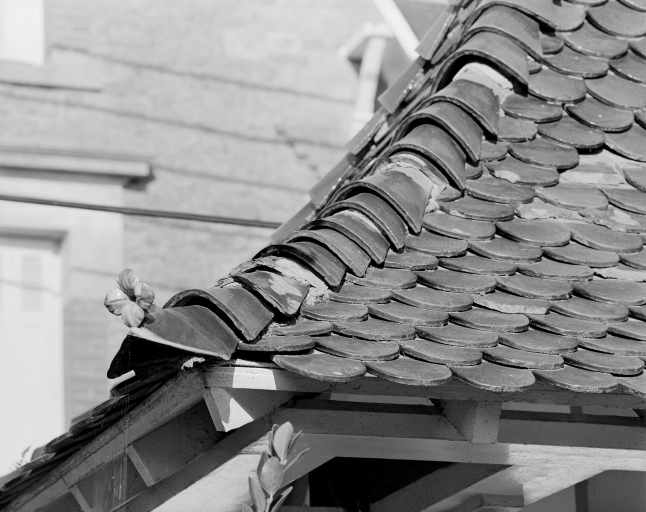 Détail de l'épis de faîtage représentant une fleur en bas du toit sur la partie gauche du portail d'entrée de la maison Le Roc 29 rue de le Pionnière.Immatriculation