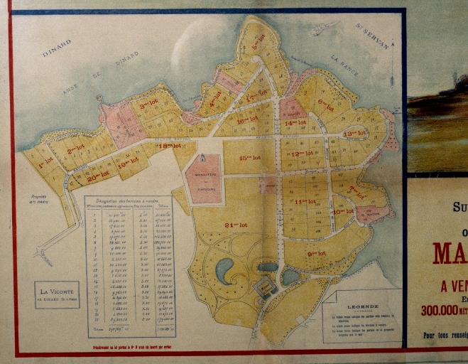 Affiche publicitaire de la vente par adjudication du 30 août 1900 avec plan de masse des 21 lots.Immatriculation
