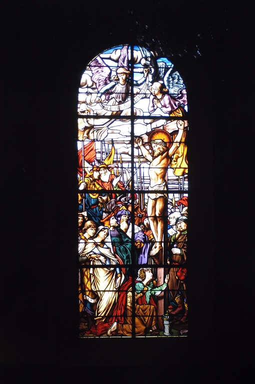 Verrière du choeur, mur nord : Crucifixion, Cène (baies n°1 et 2).Immatriculation