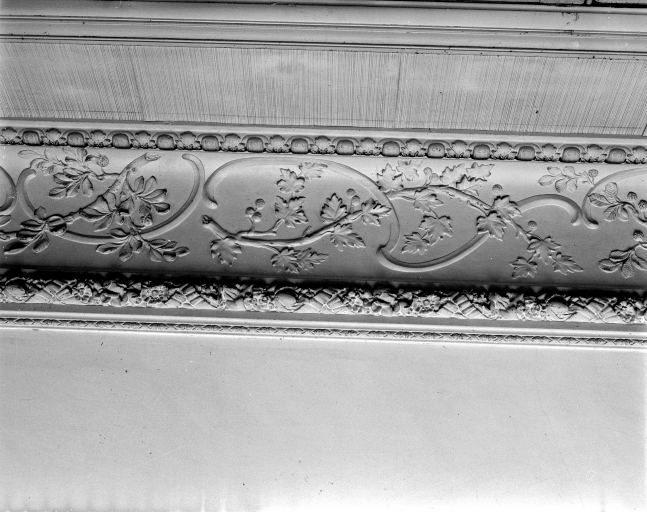 Détail de la frise du plafond du salon (feuilles de vignes, rinceaux).Immatriculation