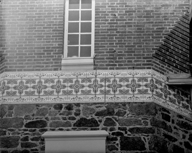 Détail de la frise en céramique de la tour carrée en demi-hors-oeuvre.Immatriculation