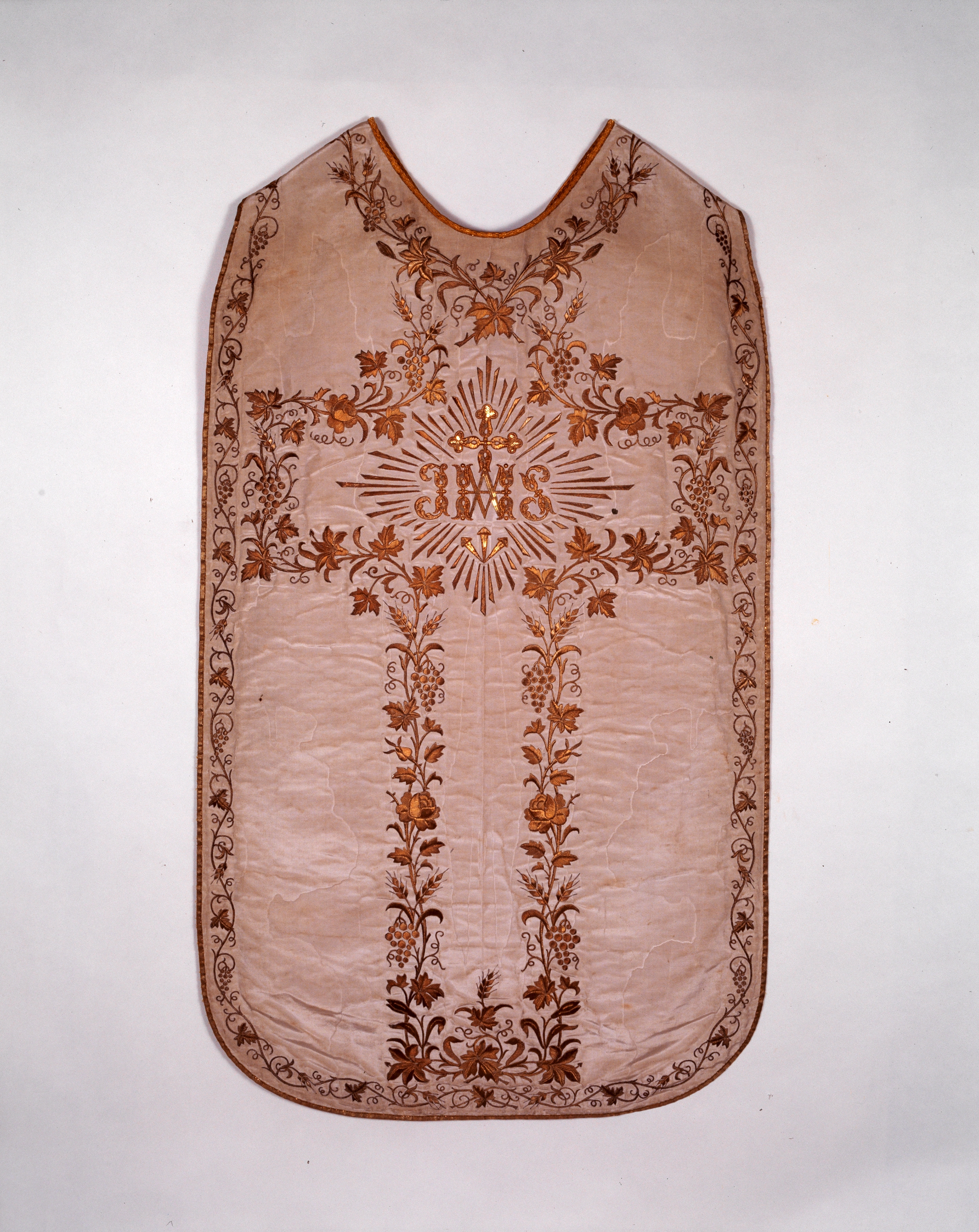 Ornement réversible blanc et rouge 2 : chasuble, bourse de corporal, étole, manipule, voile de calice, basilique Notre-Dame-du-Roncier (Josselin),