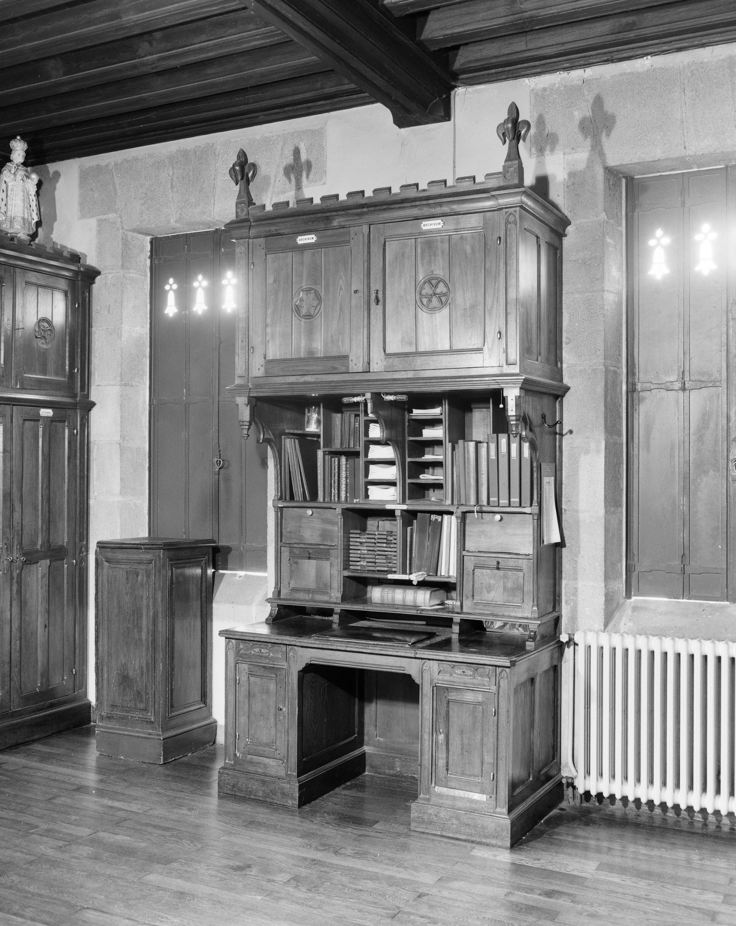 Ensemble de meubles de sacristie : 2 armoires, meuble de rangement pour objets liturgiques, tronc, bureau, armoire à archives, table, 2 placards, chasublier, basilique Notre-Dame-du-Roncier (Josselin),
