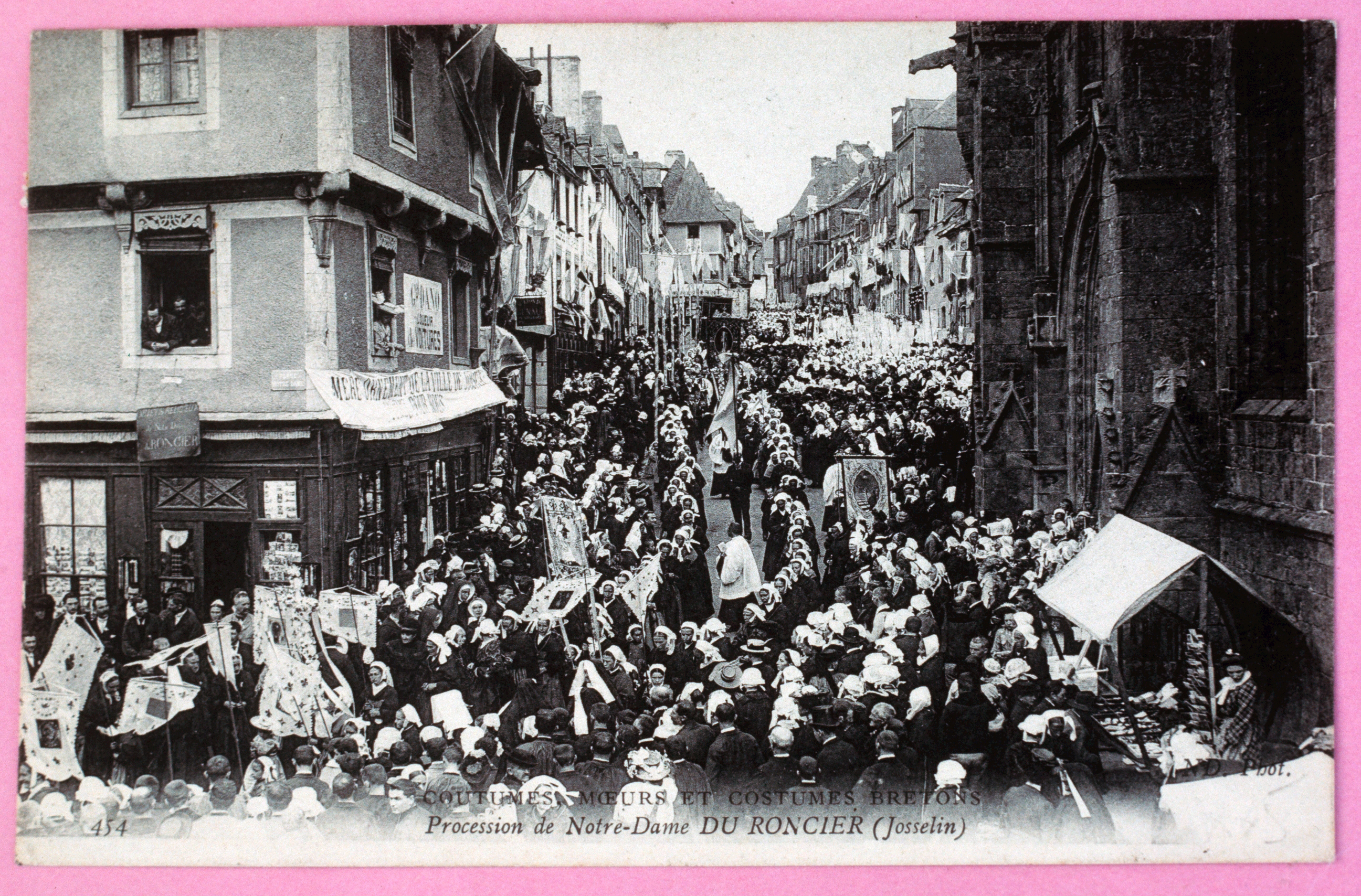 COUTUMES MŒURS ET COSTUMES BRETONS Procession de Notre-Dame DU RONCIER (Josselin). Carte postale, Paris : Neurdein Frères, édit., limite 19e-20e siècles.