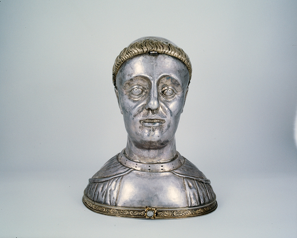 Reliquaire morphologique (chef-reliquaire) : saint Gildas, abbaye de bénédictins Saint-Gildas, de bénédictins de la congrégation de Saint-Maur, de soeurs de la charité de Saint-Louis (Saint-Gildas-de-Rhuys),