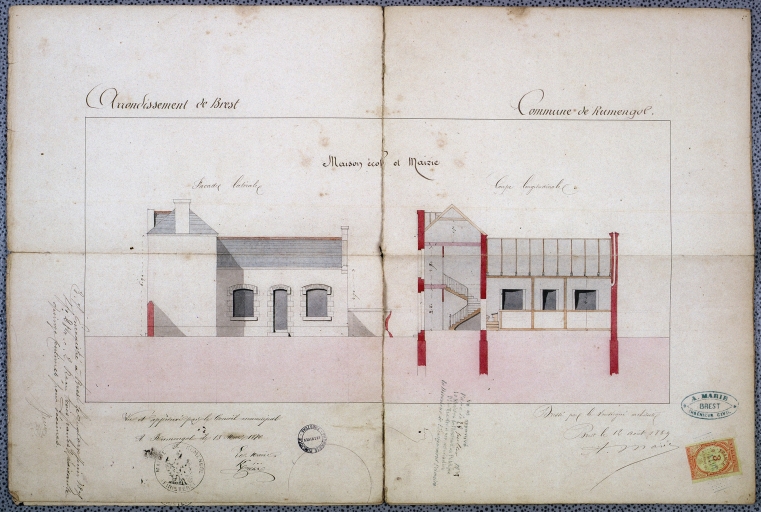 Façade latérale et coupe longitudinale. Projet A. Marie, architecte, 1869 (A. D. Finistère, 2 O 1757)Immatriculation