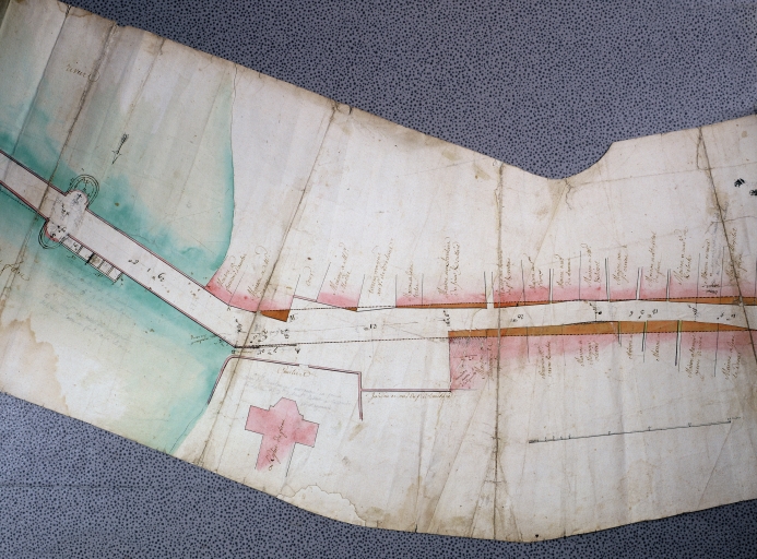 Plan dit plan de la traversée de la ville, par Le Roy, 1764. Eglise et partie nord de la Grande rue (A. D. Finistère, 1 J)Immatriculation