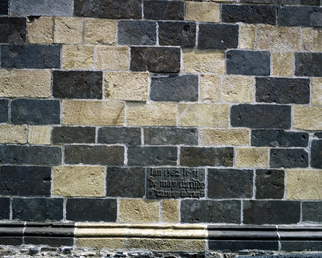 Elévation ouest : détail de la mise en oeuvre des matériaux, inscription et date (1562)Immatriculation