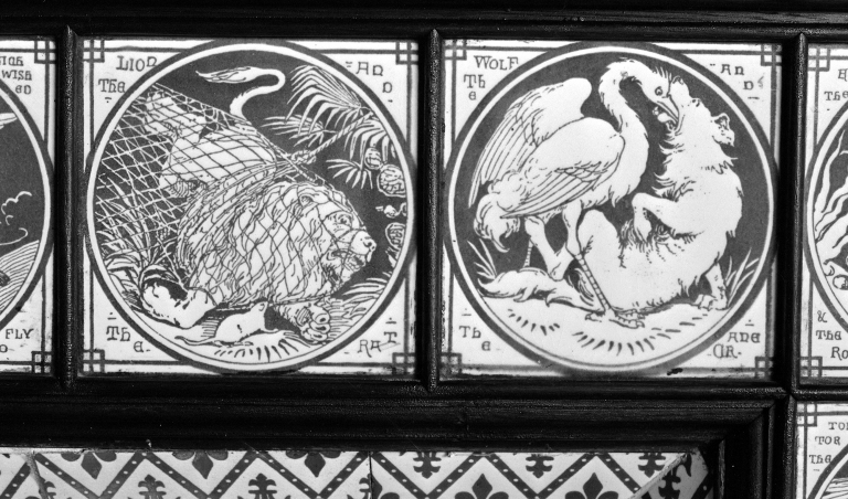 Détail du décor céramique n°3 de cheminée de la chambre 1, rez-de-chaussée.Immatriculation