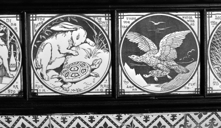 Détail du décor céramique n°2 de cheminée de la chambre 1, rez-de-chaussée.Immatriculation