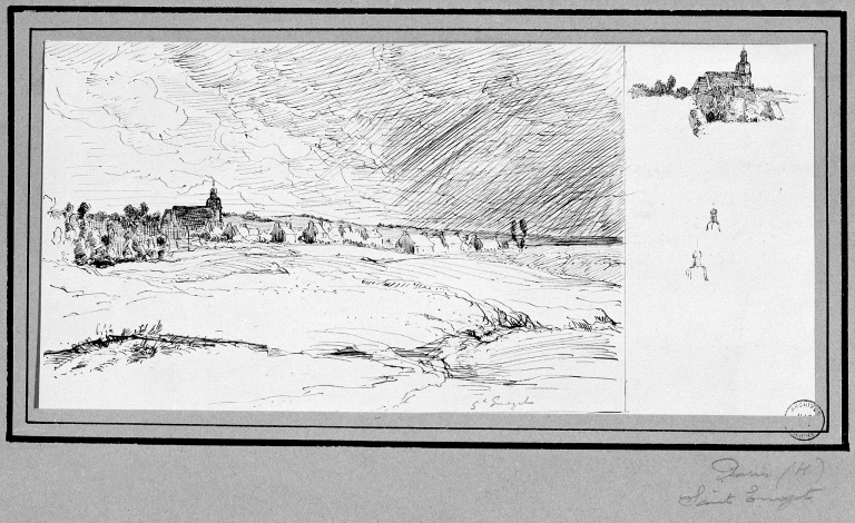 Dinard - Saint-Énogat, dessin à la plume : bourg avant la construction de la nouvelle église.Immatriculation