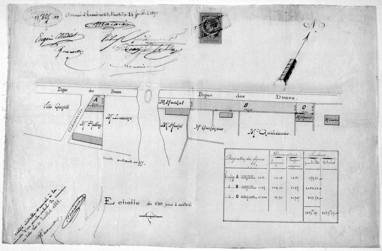 Plan des terrains de MM. Tréhu, la Haye et Madiot, sur la digue des Dunes, plan en couleur, 1889.Immatriculation