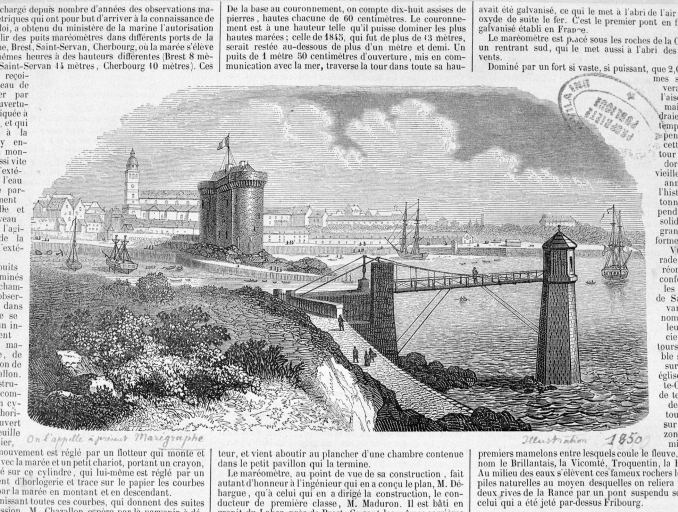 Dessin anonyme du Marégraphe et de la Tour Solidor à Saint-Servan, extrait d'un journal ("illustration, 1850", selon une note manuscrite)