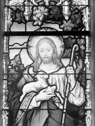 Baie n°15, détail de la verrière représentant le Christ bon pasteurImmatriculation