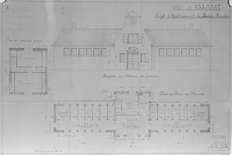 Ville de Paramé, projet d'établissement de bains-douches, plan du rez-de-chaussée et élévation sur l'avenue de Lorraine, 1937.Immatriculation