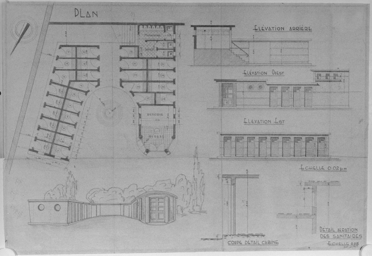 Ville de Paramé, projet d'établissement de bains à Rochebonne, plan du rez-de-chaussée et élévations, 1953.Immatriculation