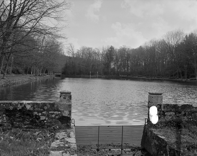 Vue générale de l'étang murée avec des colonnes.Immatriculation