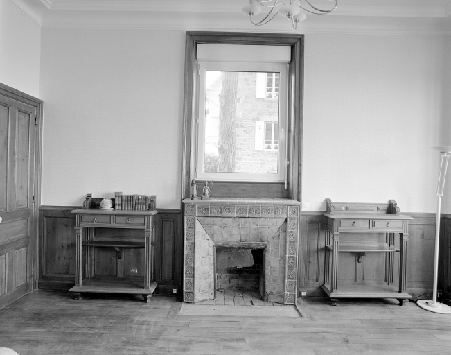 Vue générale de la cheminée en bois du salon au rez-de-chaussée.Immatriculation