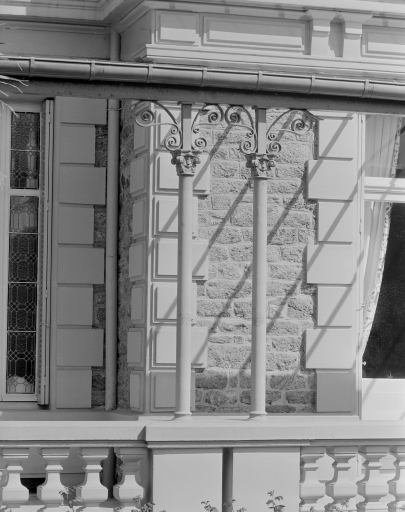 Vue de détail des piliers sous la marquise, façade sur rue.Immatriculation
